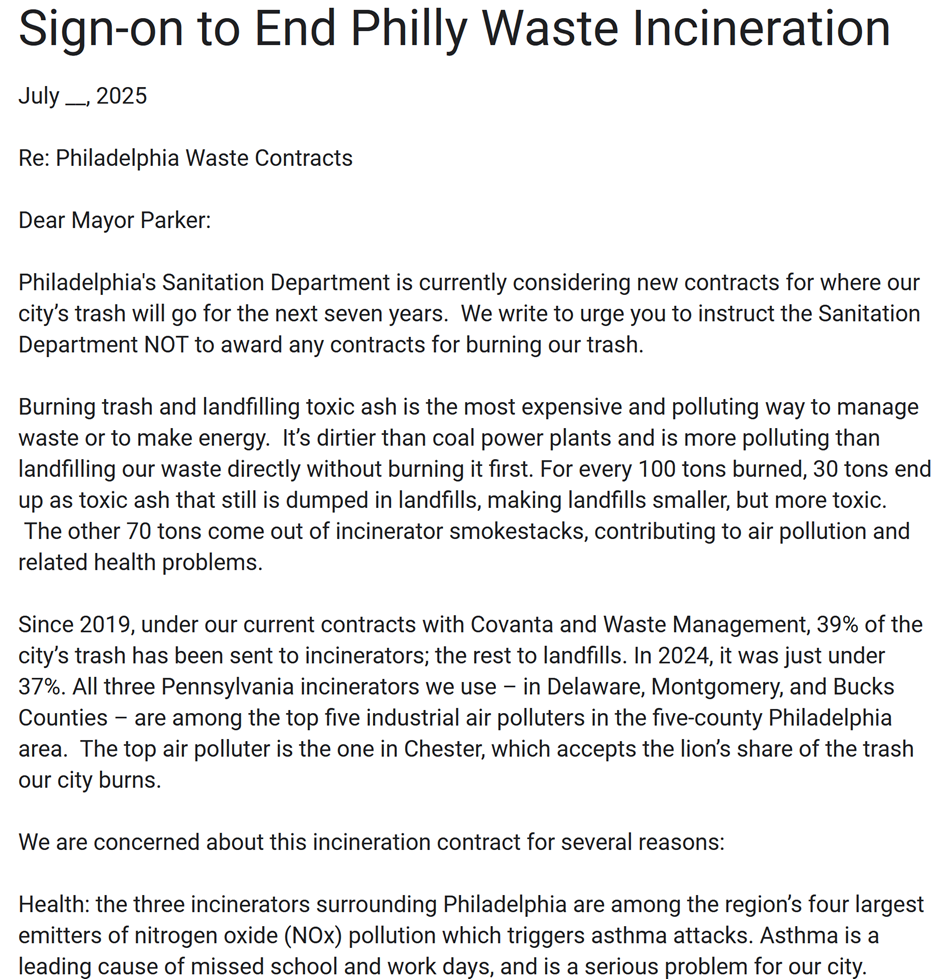 - Get us invited to educate others on the health and environmental harms of ongoing use of incineration