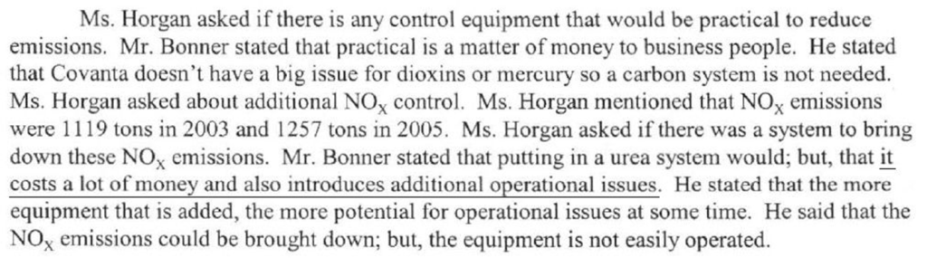 In March 2009, when an EPA inspector (Ms. Horgan) asked Covanta’s Gene Bonner why they don’t have the pollution controls that their other plants have, Covanta responded that “it costs a lot of money” and would create “operational issues.”