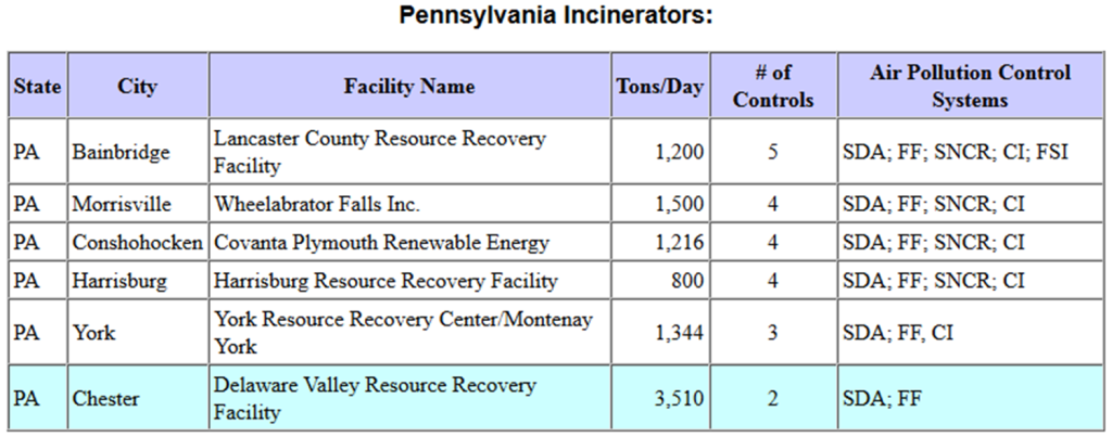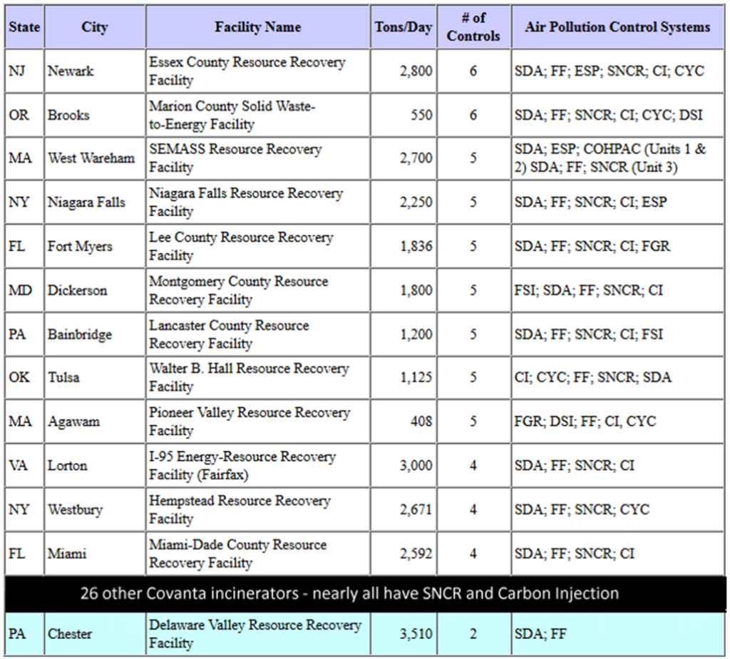 Nearly all of Covanta’s 39 incinerators have these pollution controls. Several have 5-6 pollution control devices. Chester’s has just two.